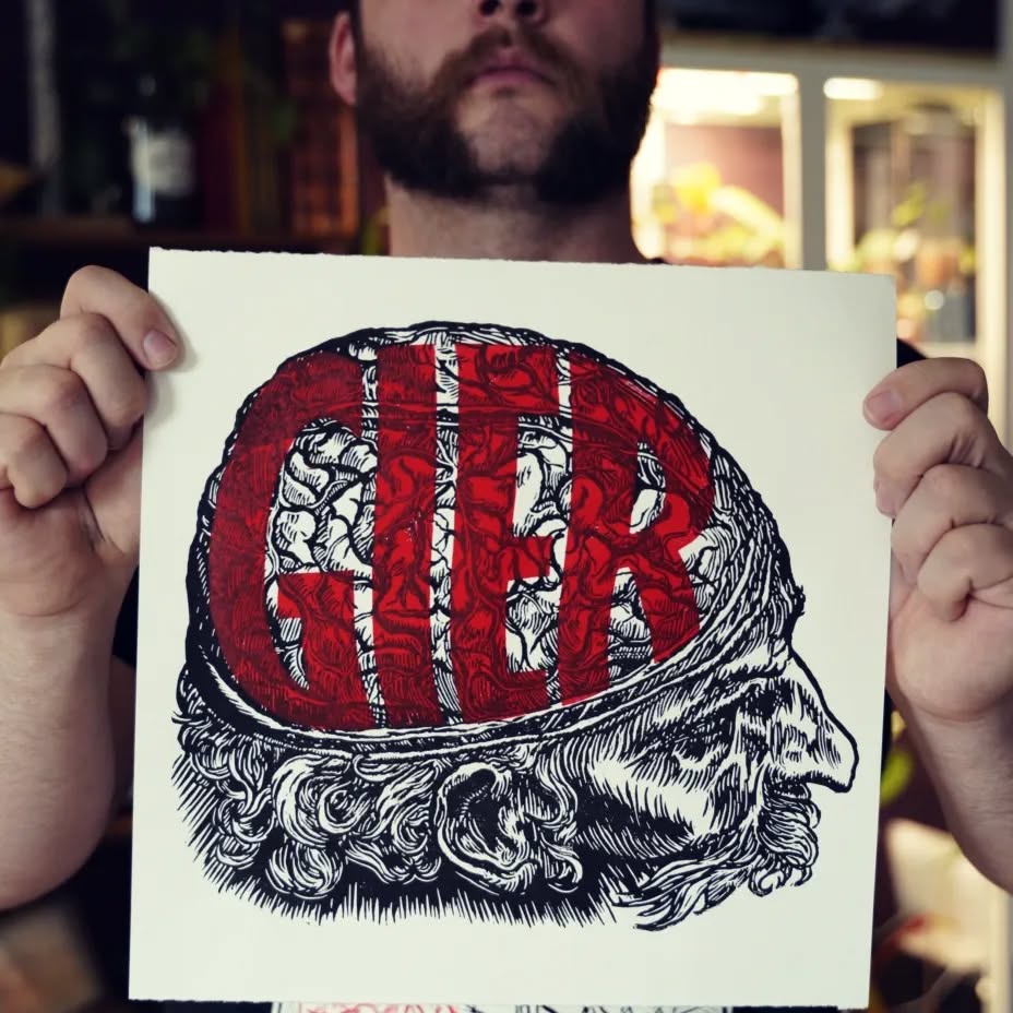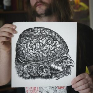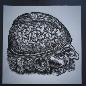 Der Linoldruck „Ares“ thematisiert den Krieg als inneren Zustand – als geistige und emotionale Triebkraft, die aus Gedanken, Begierden und Überzeugungen entsteht. Im Zentrum steht ein menschlicher Kopf, aufgeschnitten und offenbart, sein Innerstes sichtbar gemacht: das Gehirn als Schlachtfeld. In kräftigem Rot ist ein einzelnes Wort eingeschrieben – je nach Variation „Gier“ oder „Triebe“. Diese Begriffe stehen für die mentalen Auslöser von Gewalt, für die Ideen, die sich in Blut und Handlung verwandeln.