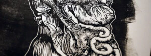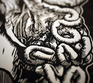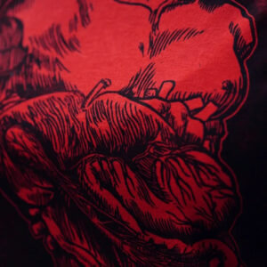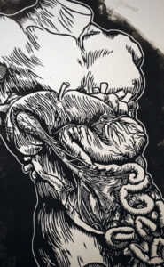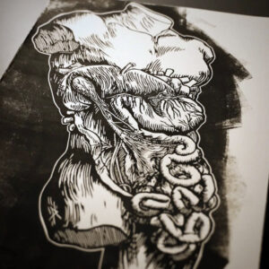 Der Linoldruck „Deimos“ von IRRLÆUFER ist eine kraftvolle Auseinandersetzung mit dem menschlichen Körper, seiner Zerbrechlichkeit und inneren Komplexität. Auf den ersten Blick wirkt das Werk wie eine archaische Statue: ein Torso, kraftvoll, antik, von Zeit und Erfahrung gezeichnet. Doch der Blick offenbart mehr – das Innere wird nach außen gekehrt. Eingeweide, Herz und Organe brechen durch die Oberfläche, roh, pulsierend, nahezu greifbar. Die Darstellung ist sowohl anatomisch als auch symbolisch – sie konfrontiert den Betrachter mit dem, was normalerweise verborgen bleibt: unserer Verletzlichkeit.