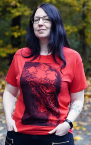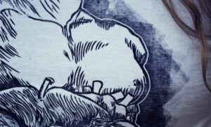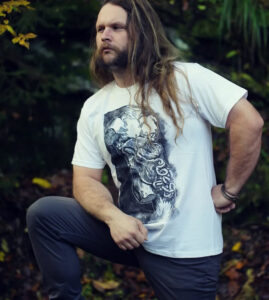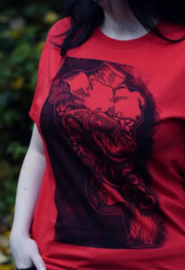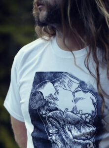 Die starke Schwarz-Weiß-Kontrastierung verstärkt die Dramatik und Unmittelbarkeit des Linolschnitts. Als Shirtdruck getragen, wird Deimos zum Statement: ein Bild des Aufbruchs aus der Oberfläche, ein Zeichen für Ehrlichkeit, Tiefe und das Unvermeidbare – unsere Menschlichkeit.