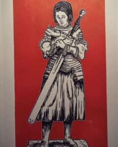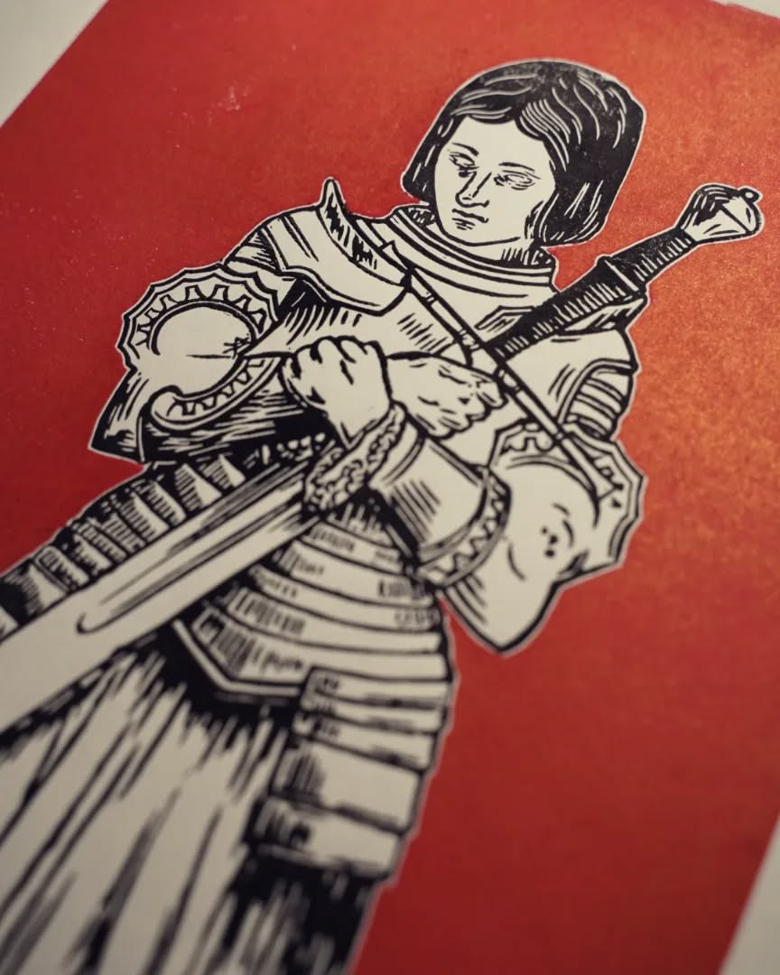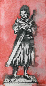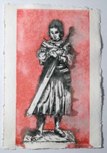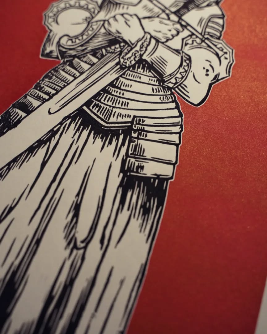 Der Linoldruck „Dike“ zeigt die Gerechtigkeit nicht als abstraktes Ideal, sondern als geerdete, stille Kriegerin. In einer Haltung, die mehr Demut als Triumph ausstrahlt, hält sie das Richtschwert vor sich – nicht zum Angriff erhoben, sondern als Zeichen innerer Prüfung. Die Anlehnung an historische Darstellungen, gepaart mit der klaren, reduzierten Farbigkeit – Goldschimmer im satten Rot und Schwarz – verleiht der Szene eine ikonische Schärfe.