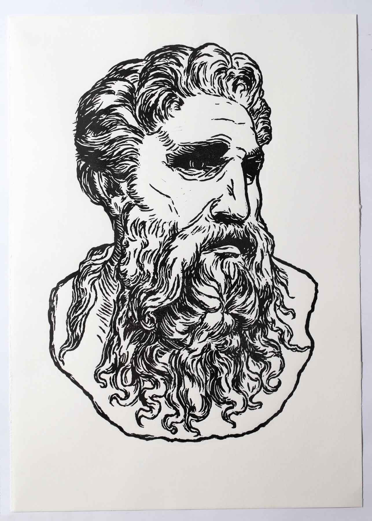 “Jupiter” is not a glorified ideal, but an ambivalent symbol of power, wisdom, and solitude. The linocut technique amplifies this tension with its stark contrasts and tactile roughness—light and shadow vie for dominance, just as they often do in mythological tales.