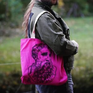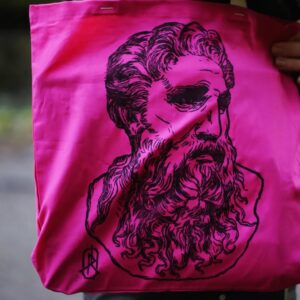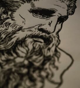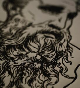 The linocut “Jupiter” by IRRLÆUFER unfolds a powerful presence that oscillates between ancient grandeur and timeless melancholy. The depiction of the father of the gods is raw, monumental, and yet profoundly human. Through dense, expressive lines, a gaze shaped by experience is revealed—not triumphant, but introspective. The flowing beard cascades downward like a river of thoughts, streaming endlessly through the centuries.