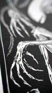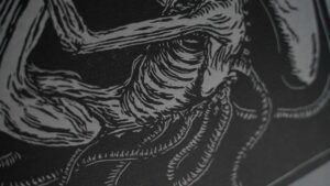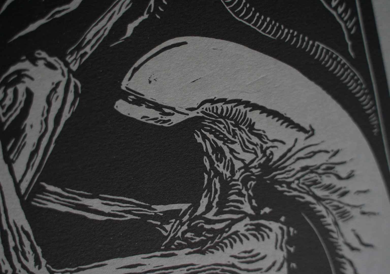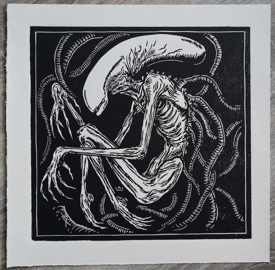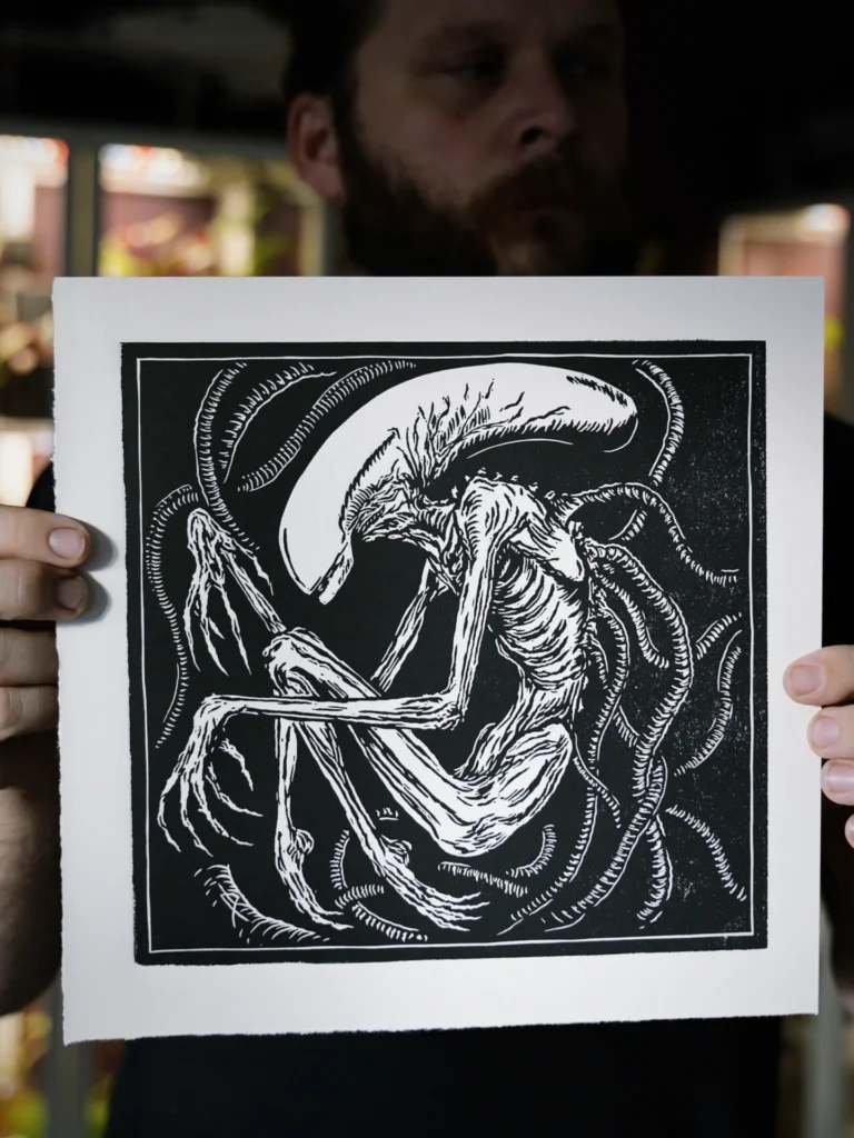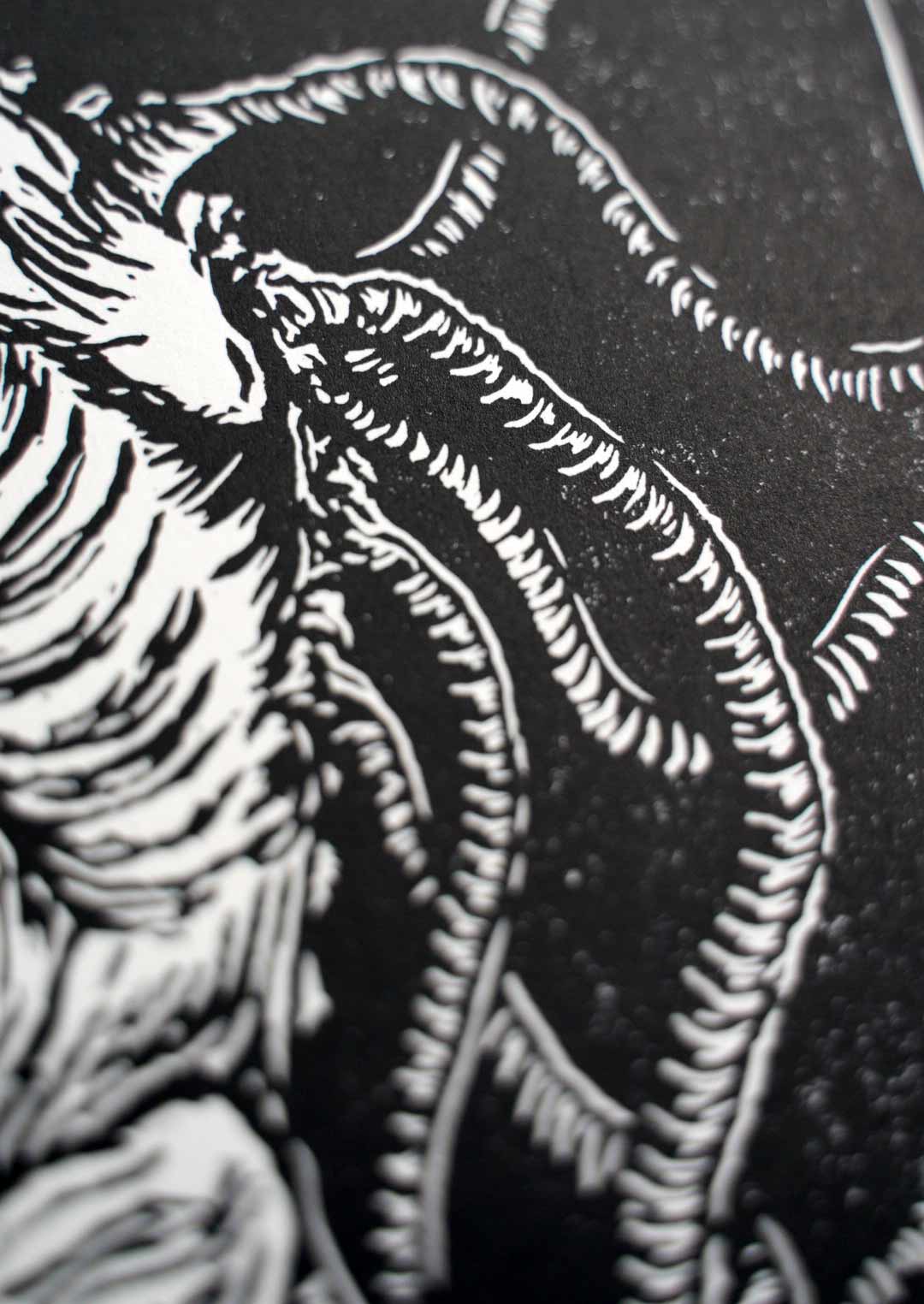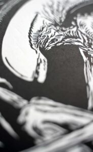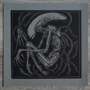 Mit „Ergrauter Gott“ verneigt sich IRRLÆUFER vor einem seiner größten künstlerischen Einflüsse – dem Schaffen von H.R. Giger. Der Linoldruck ist keine bloße Hommage, sondern eine tief empfundene Würdigung eines Werkes, das Generationen von Künstler:innen geprägt hat. In der Auseinandersetzung mit Gigers Ästhetik, in der das Organische und das Mechanische ineinanderfließen, sucht IRRLÆUFER nach einem eigenen Zugang zu Themen wie Schöpfung, Verfall und Ewigkeit.