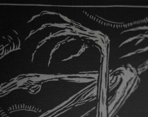 Der Linoldruck fängt diese Stimmung mit grafischer Klarheit ein. Die Reduktion auf Schwarz und Weiß verleiht der Figur eine fast skulpturale Präsenz. Die feinen, scharfen Schnitte im Linoleum erzeugen Tiefe und Textur, während das Wechselspiel von Licht und Schatten den Eindruck von Bewegung und Verfall verstärkt. In der handwerklichen Präzision des Drucks spiegelt sich sowohl technische Meisterschaft als auch eine spürbare, persönliche Nähe zum Motiv wider.