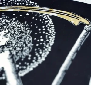 In dem kraftvollen Linoldruck „Ker, Tochter der Nyx“ von IRRLÆUFER begegnet uns eine mythologische Figur mit eindrucksvoller Präsenz. Die Darstellung ist roh, direkt und von dunkler Symbolik durchzogen. Ker, in der griechischen Mythologie eine der personifizierten Todesgöttinnen und Tochter der Nacht (Nyx), wird hier als nackte, selbstbewusste Frau mit wilder Mähne gezeigt. In der einen Hand hält sie eine mächtige, teils vergoldete, Sense – Symbol des Todes und Herrschaftlichkeit – in der anderen die skeletierten Überreste eines Menschen. Ihre Haltung ist gelassen, fast tänzerisch, als würde sie über die Schwelle zwischen Leben und Tod schreiten.
