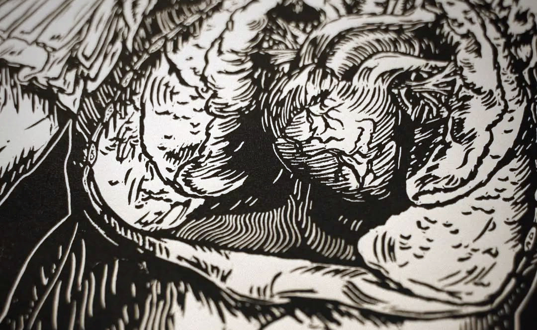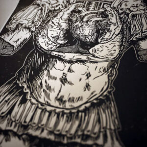 Der Titel „Phobos“, benannt nach dem griechischen Gott der Furcht und Sohn des Ares, verweist auf eine emotionale Landschaft des Krieges, der inneren Spannungen und der psychischen Belastung. IRRLÆUFER verbindet klassische Ästhetik mit moderner Symbolik und öffnet einen Raum für Interpretationen zwischen Krieg, Männlichkeit, Verwundbarkeit und Identitätsverlust. Die grobe, kontrastreiche Linoldruck-Optik verstärkt den Eindruck von roher Emotion und innerem Chaos.