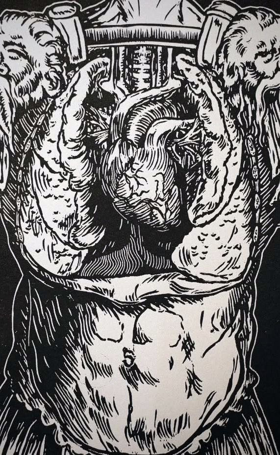 In seinem Werk „Phobos“ erschafft der Künstler IRRLÆUFER eine kraftvolle visuelle Allegorie der Angst und inneren Zerrissenheit. Die Darstellung eines kopflosen, muskulösen Körpers in römischer Rüstung, auf dessen Schultern zwei Widderköpfe ruhen, ruft Assoziationen zu archaischer Macht, Opfer und Bedrohung hervor. Im Zentrum sitzt ein anatomisch detailliertes Herz, das in der offenen Brust liegt und in seiner natürlichen Position hängt – als würde es zur Opferung dargeboten. Die Widder, Symbolträger von Aggression und Stärke, bilden eine groteske Rüstung, die sowohl schützt als auch einengt.